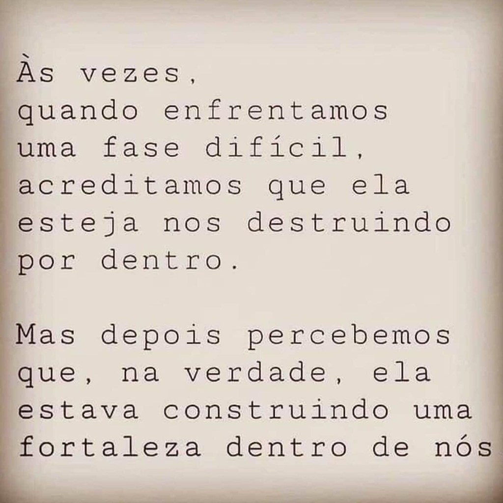 Às vezes quando enfrentamos uma fase difícil, acreditamos que ela esteja nos destruindo por dentro. Mas depois percebemos que, na verdade, ela estava construindo uma fortaleza dentro de nós!